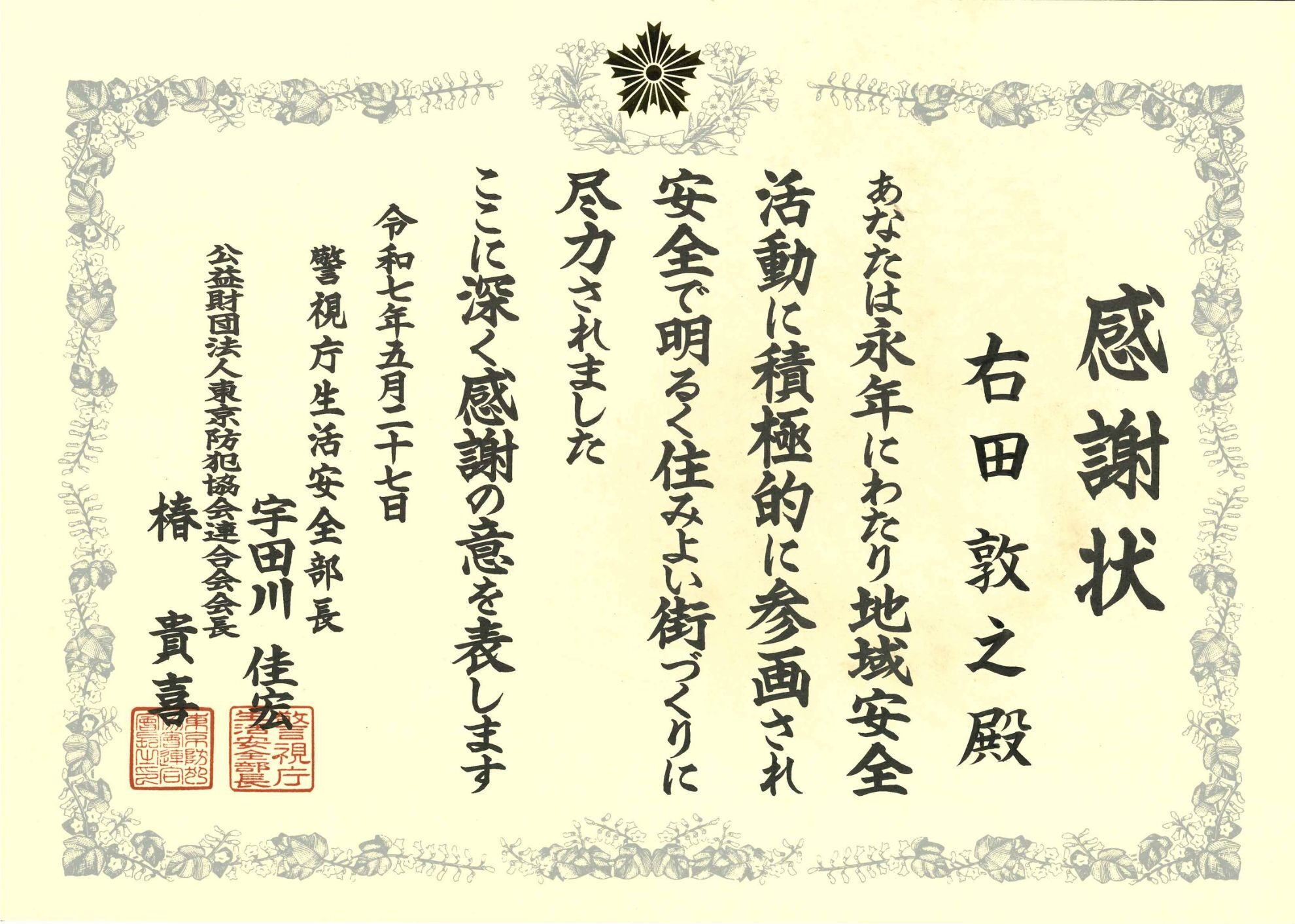感謝状 警察庁生活安全課 R7.5.27