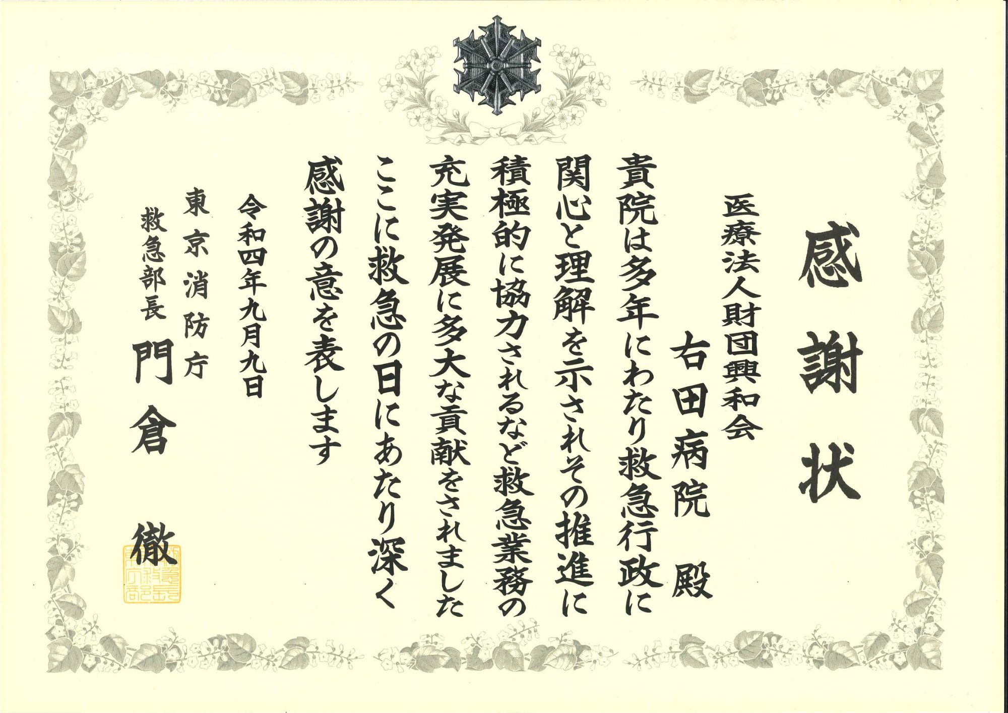感謝状 東京消防庁 R4.9.9
