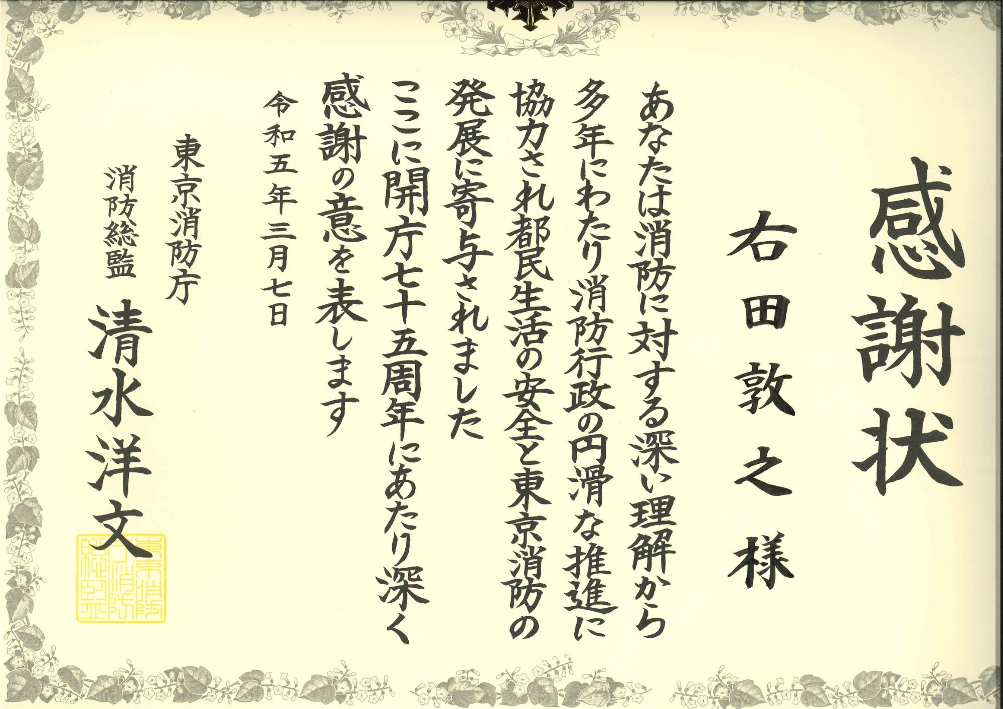 感謝状 東京消防庁 R5.3.7